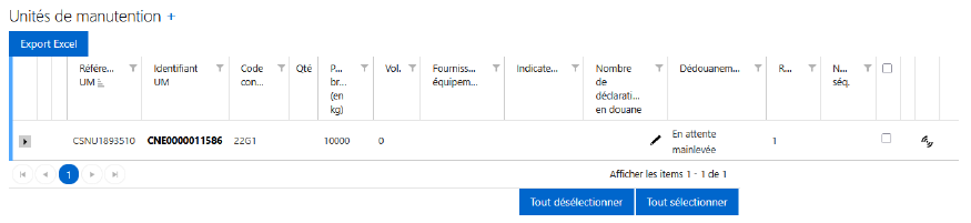 Dans le bloc Unités de manutention, je visualise la colonne Dédouanement « En attente mainlevée ».